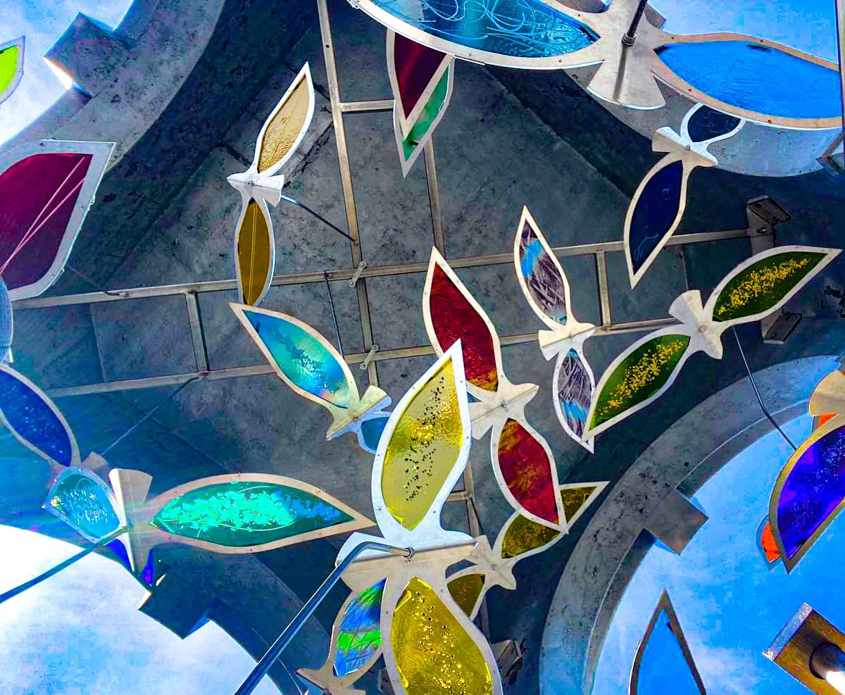 A large public art installation titled โFlockโ, displaying birds made of glass and metal inside the belltower at St Charles Market, Ottawa ๐
